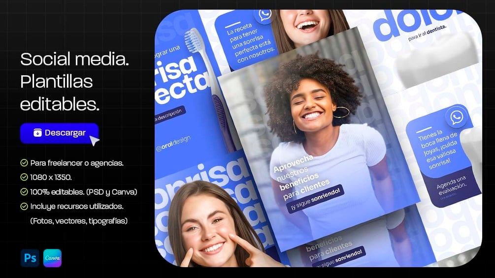 Odontología 1.0 - Social media (Editable PSD y Canva) + Recursos.