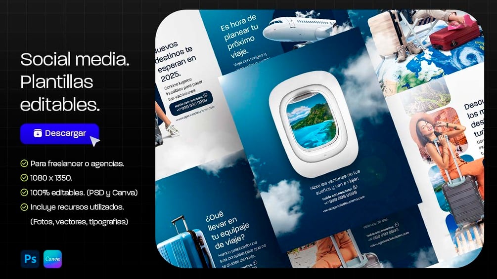 Agencia de viajes - Social media (Editable PSD y Canva) + Recursos.
